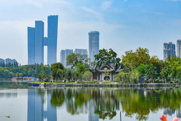 莫愁湖畔,秋意正浓,湖水碧透如镜,映照着天空的云彩,湖面微风拂动,泛起涟漪,宛如一层层细密的笔触点缀其中。