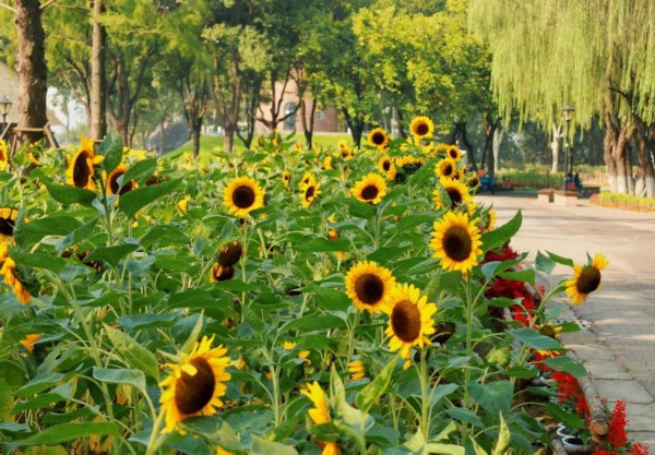 金黄的银杏、向日葵,橙红的丹桂、硫华菊,红棕的水杉、法国梧桐,与被秋意浸染的金陵城构成层次丰富的棕色系“美拉德”滨江公园。
