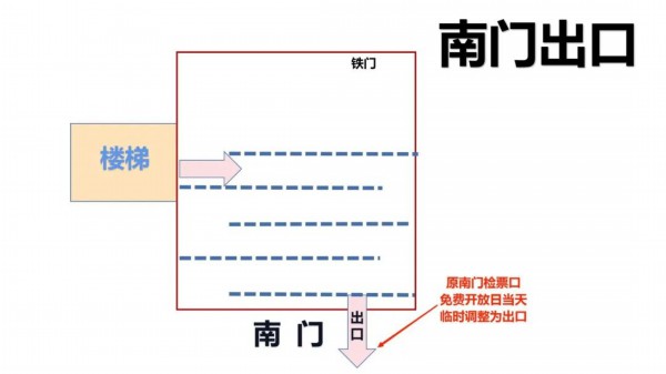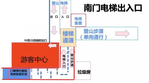 4.由于免费开放日当天人流量较大,景区开放东门游客中心出入口及南门游客中心电梯出入口(南门登山步道单向步行向上),原南门检票口临时调整仅为出口。