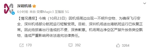10月23日,据@深圳机场:因机场周边出现一不明升空物,为确保飞行安全,深圳机场部分航班运行短暂受限。目前,深圳机场进出港航班运行已恢复正常。因此给旅客出行造成的不便,深表歉意。机场周边净空区严禁升放各类空飘物,造成严重影响将依法追究法律责任。