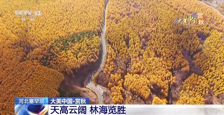 总台记者 王曦:在接近龙山的最高点——海拔接近1200米的观景平台上,可以看到万亩红叶如火似霞,布满山间。因为这里树种多样,从空中俯瞰,起伏的山峦仿佛披上了彩色的外衣,深绿、橙、红交织在一起,再加上蓝天的配色,构成了秋日里一幅绝美的油画。