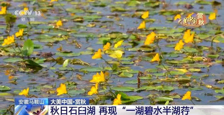 秋色宜人,秋景绚丽。在安徽马鞍山市博望区的石臼湖内,粼粼清波上,成片的金黄色荇菜 花开正盛,呈现出一幅“一湖碧水半湖荇”的美丽生态画卷。