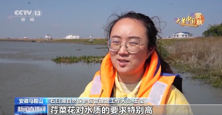 石臼湖自然保护区管理站工作人员 王莹:荇菜花对水质的要求特别高。石臼湖之前一直是进行围网养殖的,2017年开始我们把围网都拆除了,将渔民安置上岸,之后就进行了一系列的生态修复工程,生态环境明显变好。特别是水质变好之后,荇菜花又一次出现在了石臼湖湖面上,这和生态修复、湿地保护以及水质管理是密不可分的。