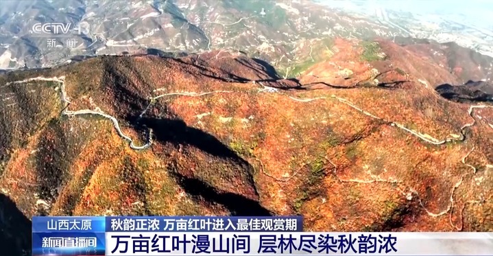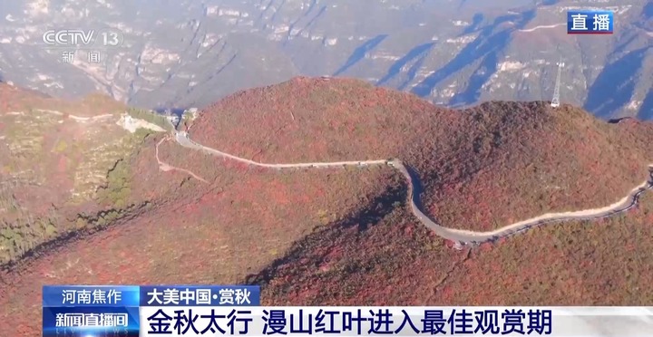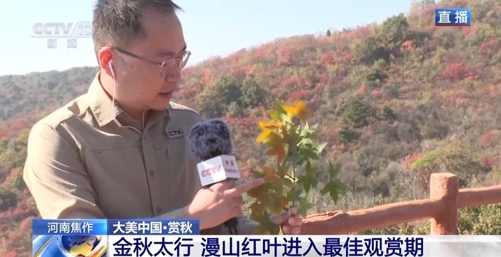 总台记者 王涛:我现在在焦作博爱县的青天河风景区十万亩红叶的观赏平台上,在这里能感觉到太行秋色壮美如画,当地人都说南太行把最美的风景留给了秋天,而在秋天里,最亮丽的色彩当属于这满山的红叶了。