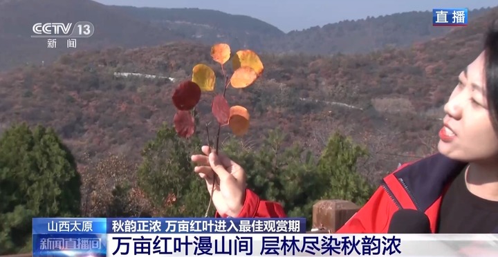 总台记者 王曦:目前这里的树木种类有60多种,包括油松、侧柏、山杏、山桃等。黄栌是我国重要的观赏红叶树种之一,树冠呈圆形。因为黄栌具有耐寒,耐干旱贫瘠等特点,所以成了太原周边山地种植的主要树种之一。每年寒露节气过后,黄栌的叶片颜色就要从绿色开始发生变化了。