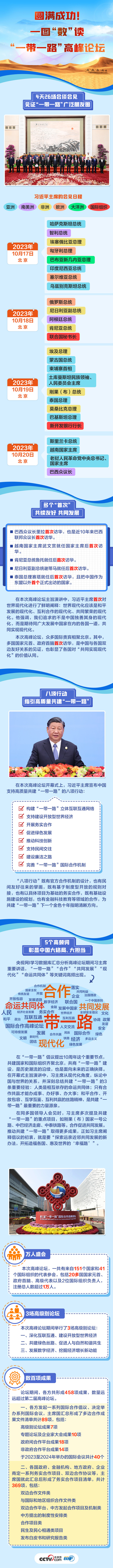 联播+ 10月17日至18日,第三届“一带一路”国际合作高峰论坛在北京举行。来自151个国家和41个国际组织的国际贵宾,跨越山海共赴这场追求和平发展、合作共赢的盛会。习近平主席20多场密集会见释放了哪些重要信息?本届高峰论坛取得多少重要成果?此次论坛何以成为又一个重要里程碑?央视网《联播+》为您“数”读。
