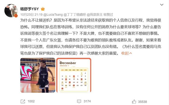 荔枝新闻讯 10月23日,女篮国手、广东女篮队员杨舒予在个人社交账号发文,拒绝粉丝接机、拒绝粉丝蹲守未公开训练行程并索要签名等行为,称这样非法获取自己个人信息和行程的事情,让自己感觉很恐怖。