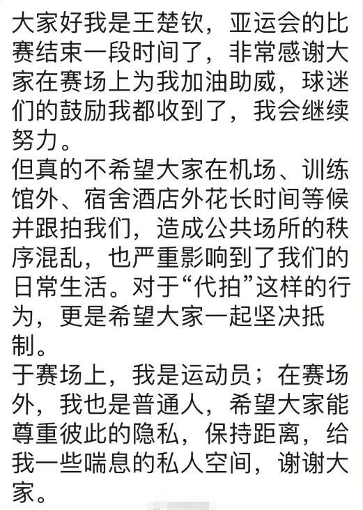 10月14日深夜,据王楚钦超话主持人@王楚钦_HOPE的氢气球工坊发文,称收到前方委托,代王楚钦发文抵制“代拍”和长时间跟拍等行为。文章表示,“真的不希望大家在机场、训练馆外、宿舍酒店外花长时间等候并跟拍我们,造成公共场所的秩序混乱,也严重影响到了我们的日常生活。”
