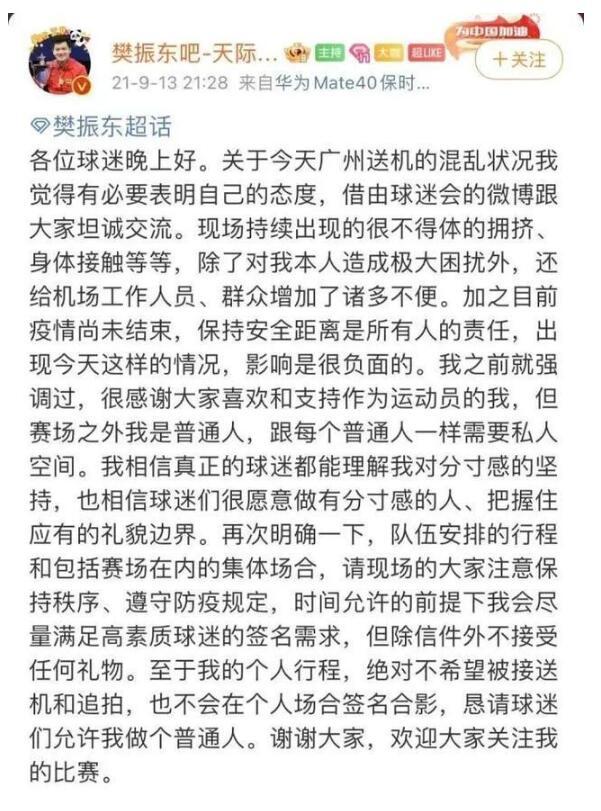 2021年9月13日,樊振东发文回应“球迷送机”一事,“恳请球迷们允许我做个普通人。”