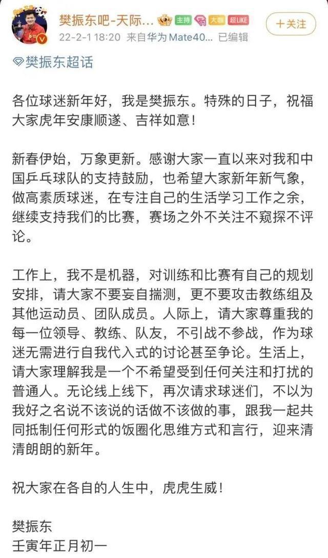 2022年正月初一,樊振东再次发文呼吁,“跟我一起共同抵制任何形式的饭圈化思维方式和言行,迎来清清朗朗的新年。”