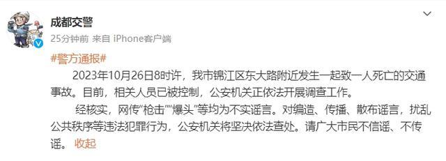 荔枝新闻讯 据@成都交警微博消息,2023年10月26日8时许,成都市锦江区东大路附近发生一起致一人死亡的交通事故。目前,相关人员已被控制,公安机关正依法开展调查工作。