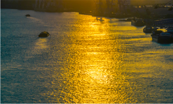 天空泛着红晕,霞光倒映在水中,形成了好看的光影。