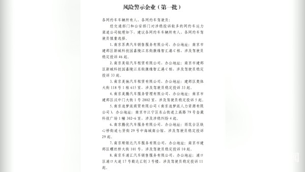 继发布网约车经营风险提示之后,近日,南京交通部门又公布了首批针对网约车租赁的风险警示企业。这些企业涉及的日常投诉较多,提醒各网约车车辆所有人及网约车驾驶员谨慎选择。