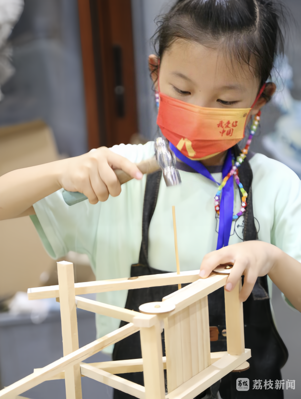 下午,各路主题的班级分队返回青少年宫,同学们纷纷坐进手工工坊,搭建木桥、拼搭宫灯、制作香囊,用双手去实践非遗工艺的精巧博大。学生钱致宁说:“通过今天的学习,我们学习到了桥梁的工程结构,体验了搭建的过程,当了一回小小工程师。”