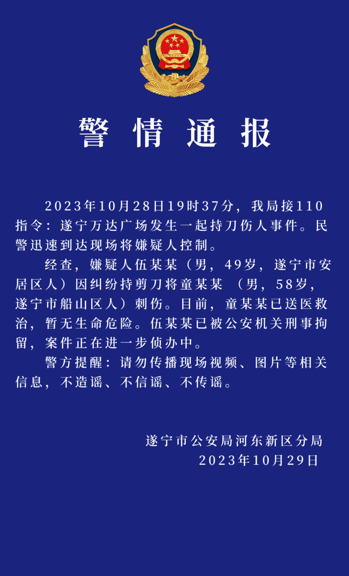 荔枝新闻讯 据遂宁公安微信公众号消息,10月29日,四川遂宁市公安局河东新区分局通报,10月28日19时37分,警方接110指令:遂宁万达广场发生一起持刀伤人事件。民警迅速到达现场将嫌疑人控制。