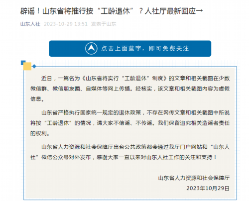 近日,一篇名为《山东省将实行“工龄退休”制度》的文章和相关截图在少数微信群、微信朋友圈、自媒体等网上传播。经核实,该文章和相关截图内容为虚假信息。山东省严格执行国家统一规定的退休政策,不存在网传文章和相关截图中所说将按“工龄退休”的情况,请大家不信谣、不传谣。我们保留追究相关造谣者责任的权利。山东省人力资源和社会保障厅出台公共政策都会通过我厅门户网站和“山东人社”微信公众号对外发布,感谢大家一直以来对山东人社工作的关注和支持!