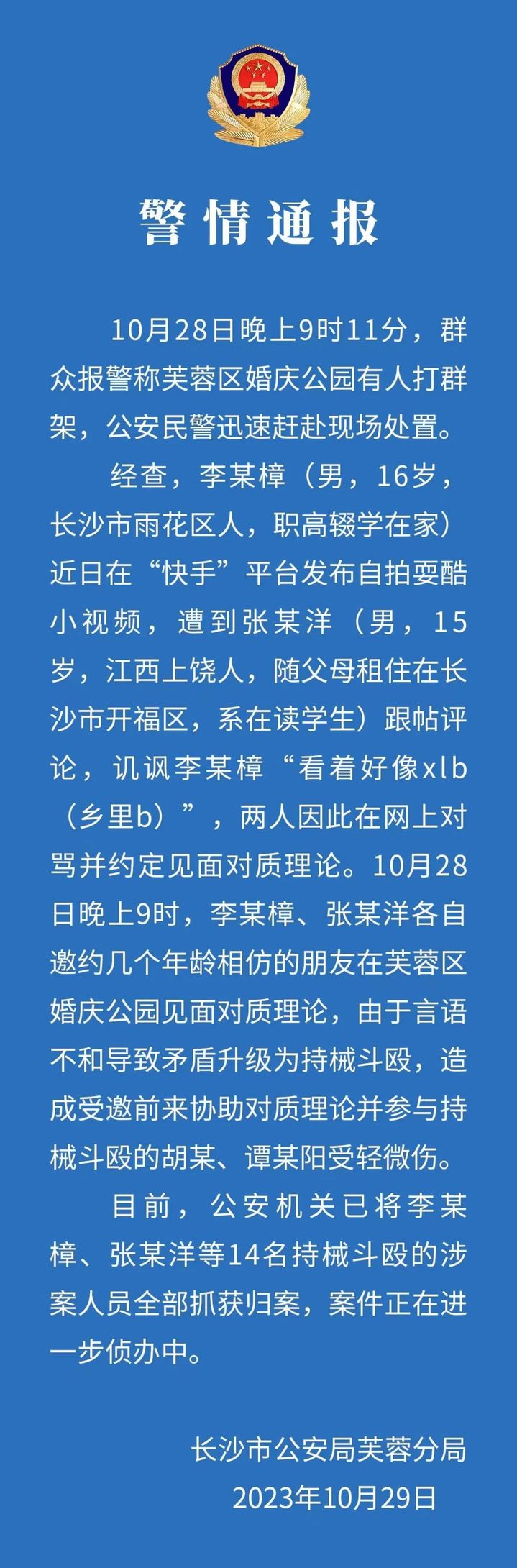 长沙市公安局芙蓉分局29日通报显示,目前,公安机关已将李某樟、张某洋等14名持械斗殴的涉案人员全部抓获归案,案件正在进一步侦办中。