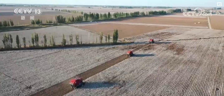 新疆是我国最重要的优质棉花产区。眼下,新疆塔城地区沙湾市的近170万亩棉花已进入最后采收期。大型采棉机在田间轰鸣穿梭,记者通过架设特种镜头记录了数字化收割的全过程。采棉机按摘头分成3—6行,整齐划一协同作业,就像一把把“刷子”梳走地里的棉花。采棉机的内部采用风机负压,将一朵朵棉花顺着管道传送到集棉箱,再通过打包仓压缩成包,每隔10分钟左右就能产下一枚“蛋卷棉”,它们也被棉农称之为“金蛋”。棉农不用费心费力,这些体积庞大的“金蛋蛋”都是由采收打包一体的采棉机自动完成。