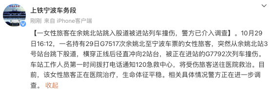 荔枝新闻讯 据上海铁路局宁波车务段,10月29日16:12,一名持有29日G7517次余姚北至宁波车票的女性旅客,突然从余姚北站3号站台跳下股道,横穿正线后径直冲向2站台,被正在进站的G7792次列车撞伤。