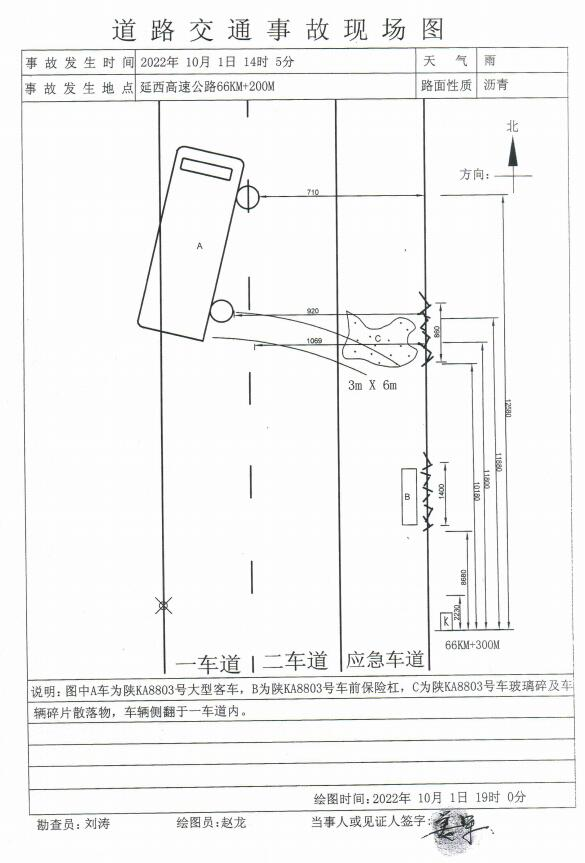 2022年10月1日14时5分,清涧分公司驾驶人惠彦斌驾驶陕KA8803号大客车(核载37人,实载33人)沿延西高速由南向北进入牛武隧道行驶在超车道上,行驶至66KM+200M处时,低头翻看手机,大客车偏离原车道,惠彦斌开始修正方向,在距隧道出口25M处大客车向左侧滑,驶出隧道后车体左侧与道路左侧波形护栏发生第一次碰撞,车辆向右侧滑,车体左前角与右侧波形护栏发生第二次碰撞,车体离地翻转,左侧着地后继续旋转滑行,车体尾部上端与左侧波形护栏第三次碰撞后停止于一车道。