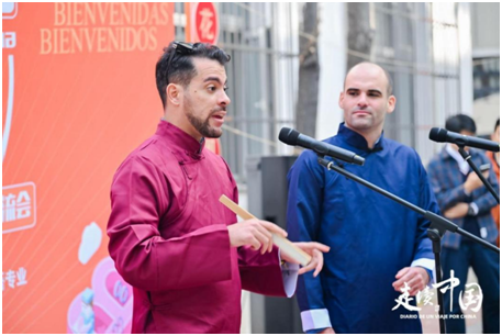 南开大学西语系主任谷佳维带来中国古典乐器琵琶演奏,南开大学的同学们也准备了中国传统武术太极扇和自选剑表演、西语诗朗诵以及西语流行歌曲演唱。外教老师们还特别将传统相声《着急》改编成西语演绎给现场的拉美朋友,引得台下笑声连连。