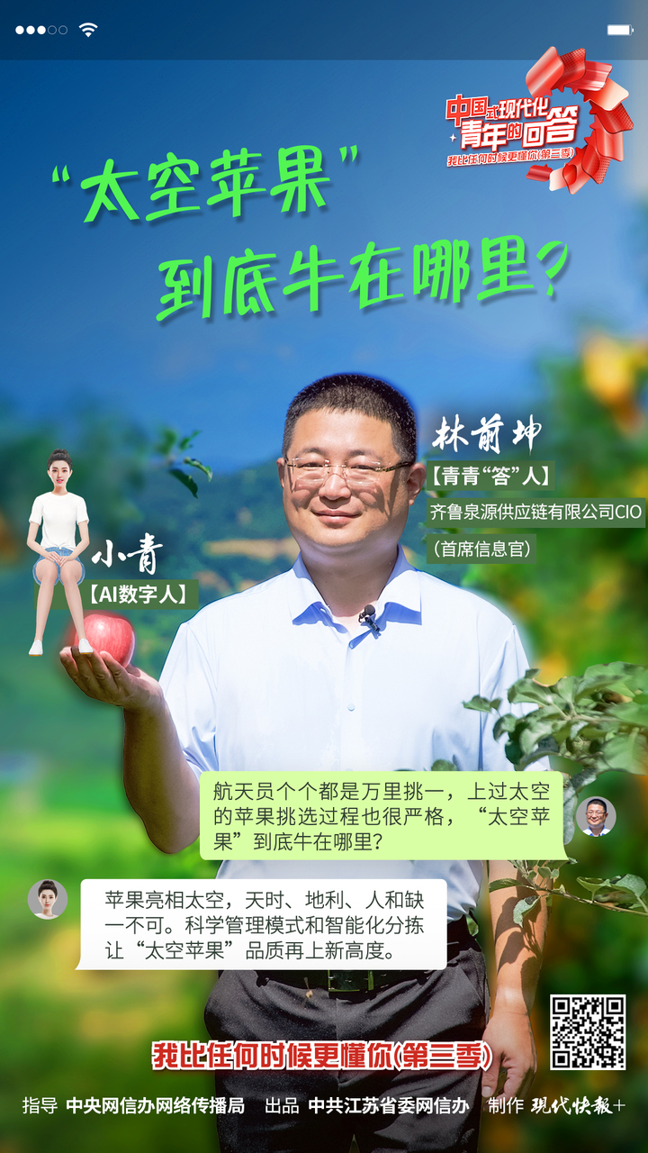 11月1日,“中国式现代化·青年的回答——我比任何时候更懂你(第三季)”系列短视频之《“太空苹果”到底牛在哪里?》正式上线。本集视频中,青青“答”人——齐鲁泉源供应链有限公司CIO(首席信息官)林前坤和AI数字人小青,带大家从果园走到智能分选车间,再到大数据平台,全流程了解同款“太空苹果”。
