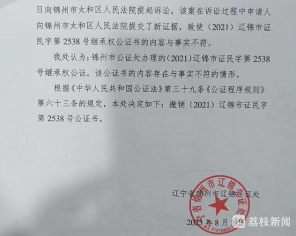 此前赵女士还了解到,保姆的儿子曾伪造材料,让养父在锦州市公证处开具了一份公证书,证明养父和养母“未曾生育子女,同时亦未收养子女”。不过赵女士提供相关材料后,公证处已将上述公证书撤销,并承认公证内容确与事实不相符。