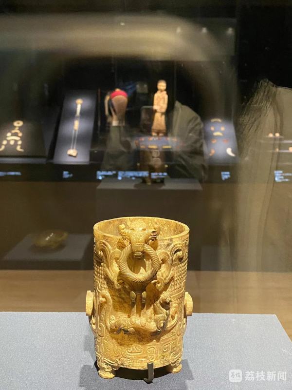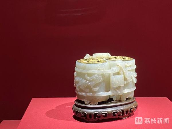 第三章“玉美神州”以三国至明清玉器发展为主线,从玉料、工艺、人文内涵等多个方面,呈现出中华玉文明的发展巅峰。唐代时,玉器图案大量采用缠枝花卉、瓜果鸟兽等为主要题材;宋代玉器器形多样化、实用化;明清时期,玉器形成了追求装饰美的艺术风格,尤其是清乾隆嘉庆年间,是集历代玉雕成就之大成达到最鼎盛时期。展览中,故宫博物院藏的“子刚”款白玉凤螭万寿纹合卺杯制作古朴典雅,上刻诗词富有情趣。左骏介绍,陆子刚是明代名闻朝野的琢玉高手,而这件作品是目前比较认可的属于陆子刚的,展品一直放在宫廷里,有学者认为这可能是明晚期某位皇帝大婚时使用的物件。
