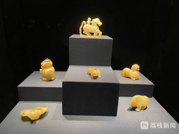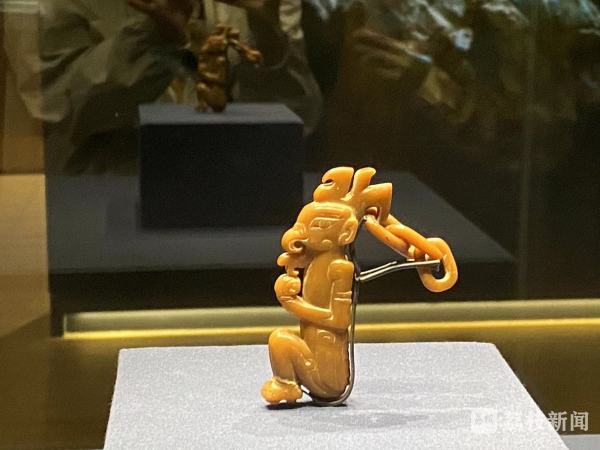 另一件展品朱雀衔环踏虎玉卮,卮身一侧高浮雕一只朱雀,朱雀头高出卮口,双目微凸,在与之相对的卮身另一侧,高浮雕一只老虎,弯曲成环形扳手。左骏说,此前,这只老虎被错认为熊,“经过我们仔细观察,动物后面还有个很长的尾巴,熊没有长尾巴,只有老虎是这样。工匠也特别有巧思,利用这块凸出来的玉料,设计了一个翻身的、威猛的、又不失可爱的老虎形象。”