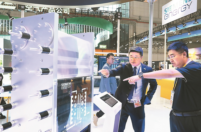 11月5日,第六届进博会在国家会展中心(上海)开幕,众多首发首展的新科技、新成果、新展品亮相。图为进博会工作人员(左)介绍西门子公司展出的电解水制氢装置模型。 新华社记者 方喆 摄