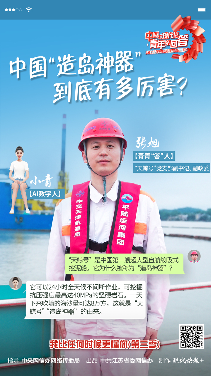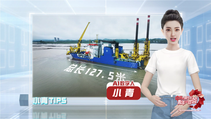 11月6日,“中国式现代化·青年的回答——我比任何时候更懂你(第三季)”系列短视频之《中国“造岛神器”到底有多厉害?》正式上线。本集视频中,青青“答”人——“天鲸号”党支部副书记、副政委张旭和AI数字人小青,带大家打卡中国首艘超大型自航绞吸式挖泥船“天鲸号”,感受中国高端装备的强大实力以及背后的中国智慧、中国力量。