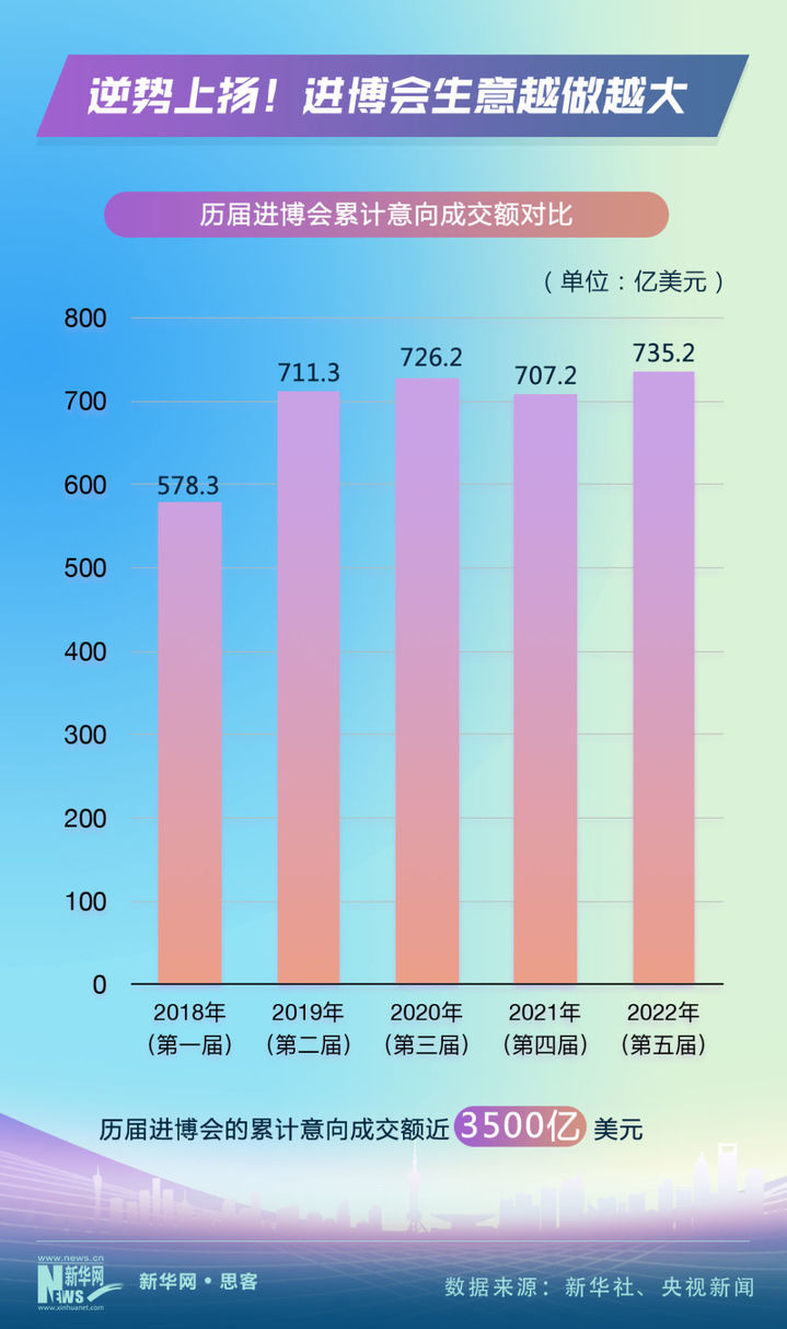 2018年11月,首届进博会在上海“初试啼声”。之后,进博会不顾风雨和险阻,年年如约而至、越办越好。数据显示,进博会的累计意向成交额从2018年的578.3亿美元,上升到2022年的735.2亿美元。前五届进博会的累计意向成交额近3500亿美元。进博会生意越做越大。