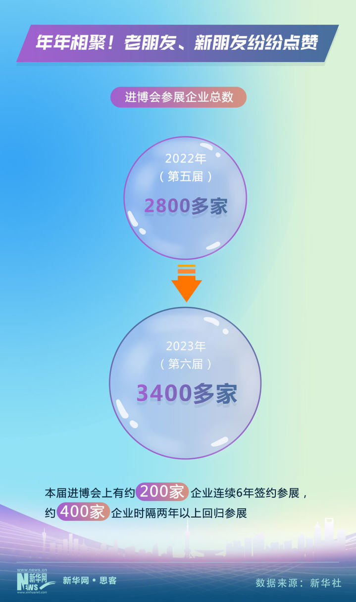进博会这个充满机遇的舞台迎接了一批又一批参展企业。据悉,本届进博会上,超过3400家参展企业在昵称为“四叶草”的国家会展中心(上海)亮相,大大超过了上届2800多家的规模。“朋友圈”不断扩大的同时,一些“老伙伴”对进博会兴趣不减。数据统计显示,约200家企业连续6年签约参展,约400家企业时隔两年以上回归参展,再次续写它们的“进博缘分”。