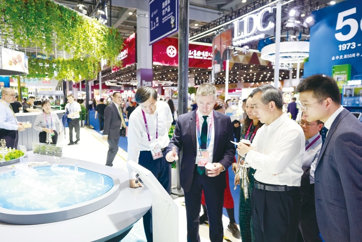 进博会嘉宾围绕在展台前参观。李昊 摄