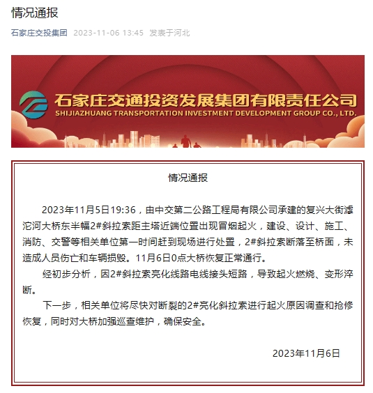 荔枝新闻讯 “石家庄交投集团”微信公众号11约6日消息,2023年11月5日19:36,由中交第二公路工程局有限公司承建的复兴大街滹沱河大桥东半幅2#斜拉索距主塔近端位置出现冒烟起火,建设、设计、施工、消防、交警等相关单位第一时间赶到现场进行处置,2#斜拉索断落至桥面,未造成人员伤亡和车辆损毁。11月6日0点大桥恢复正常通行。
