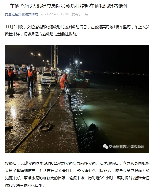 接报后,荣成救助基地派遣6名应急救助队员前往救助。抵达现场后,应急队员同现场人员了解详细信息,并认真开展安全评估。经安全评估可以作业,应急队员克服雨天能见度不好、落潮水流影响较大的困难,轮流下水,历时近3个小时,成功将3名遇难者遗体和坠海车辆打捞出水。