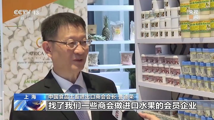 中国食品土畜进出口商会会长 曹德荣:找了我们一些商会做进口水果的会员企业,来展位去洽谈对接菠萝进口。今后几天的进博会,我们期待会有好的效果。