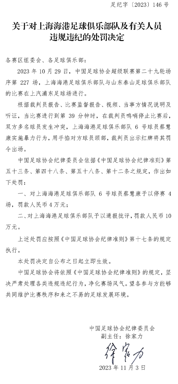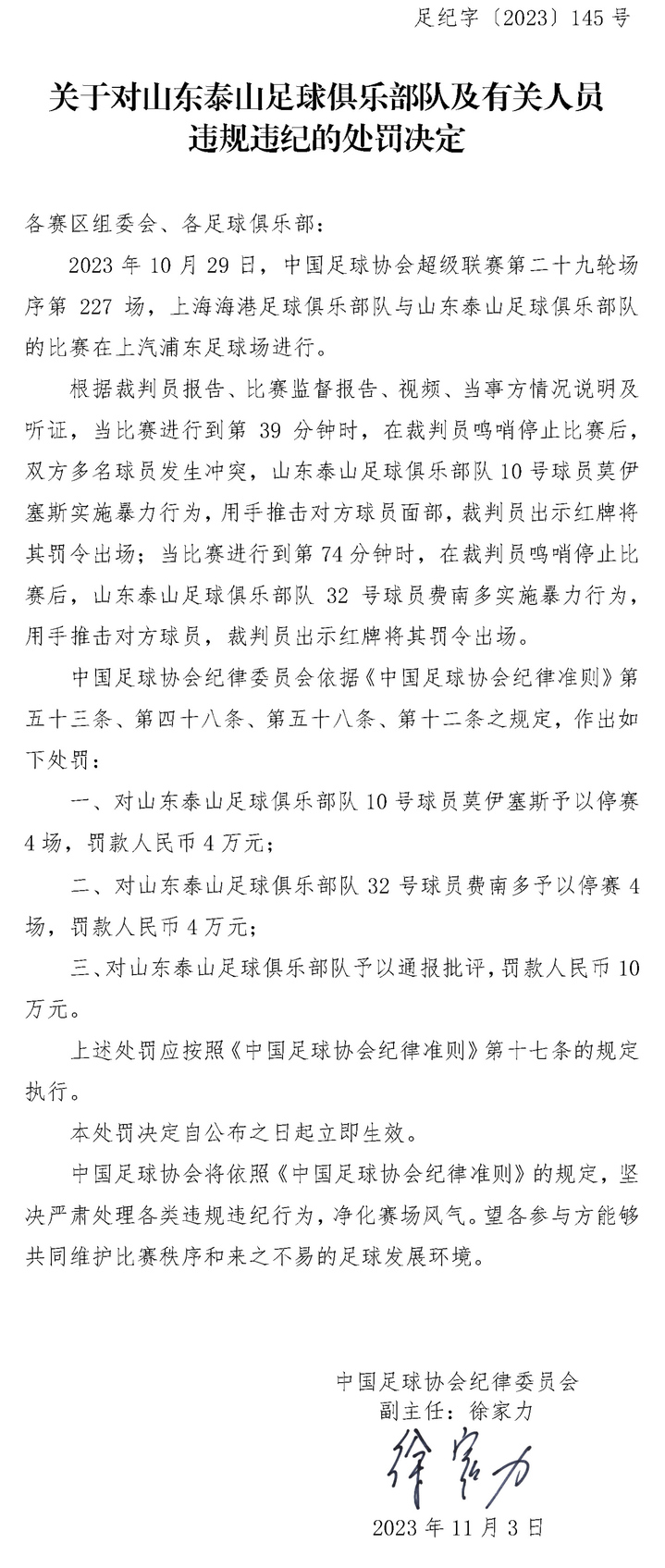 荔枝新闻讯 11月7日,中国足协官网发布《关于对山东泰山足球俱乐部队及有关人员违规违纪的处罚决定》、《关于对上海海港足球俱乐部队及有关人员违规违纪的处罚决定》,连开两张罚单。