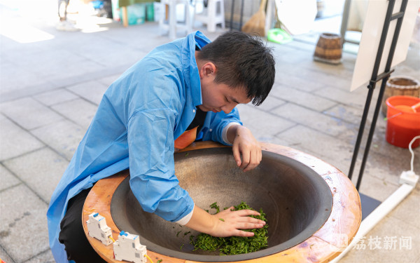 随后的手工制茶技能比赛现场,十五口炒茶锅有序排列,同学们坐在铁锅旁,活动双手,揉搓捻动,各展其能,以娴熟的制茶技巧,生动地展现了传统手工制茶的魅力。最后评委老师根据选手作品的外形、汤色、香气、滋味、叶底等内容进行综合评分,确定一、二、三等奖。