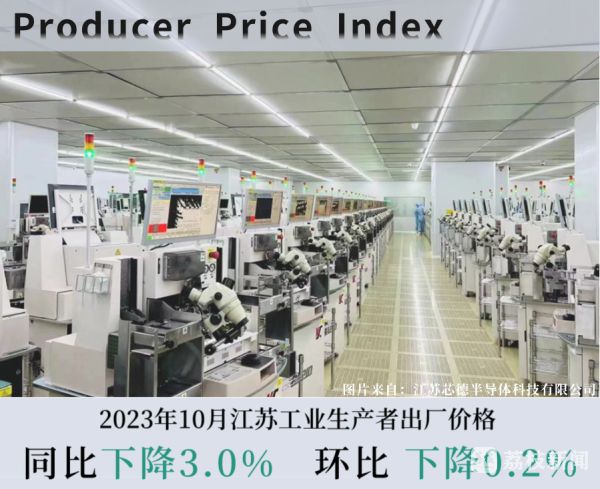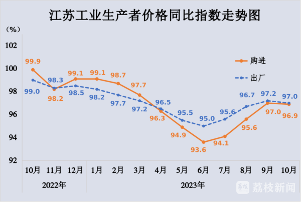 记者今天(11月9日)获悉,10月份,江苏工业生产者出厂价格同比下降3.0%,环比下降0.2%;工业生产者购进价格同比下降3.1%,环比上涨0.1%。1-10月,江苏工业生产者出厂、购进价格同比分别下降3.3%、3.6%。