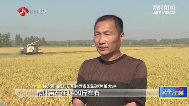 宿迁市泗洪县青阳街道金土地谷物种植家庭农场孙永刚说:“水稻长势良好,预计亩产在1400斤左右,利用最近晴好天气,组织了大型收割机6台,预计两天收割完毕。”