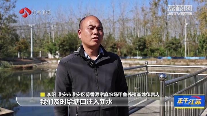 淮安市淮安区荷香源家庭农场甲鱼养殖基地负责人李阳说:“及时给池塘注入新水,保持水位在1米6左右。因为水位较低的话,导致水温变化很快,开通增氧机,尤其是在冷闷天气,防止甲鱼在泥里窒息。然后每过20到30天,对塘口进行一次消毒。”
