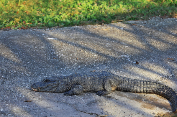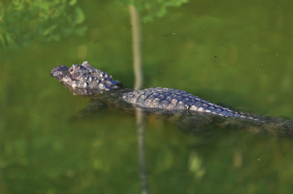 扬子鳄一动不动地待在水里,或趴在岸上,半阖着双眼,十分安逸。