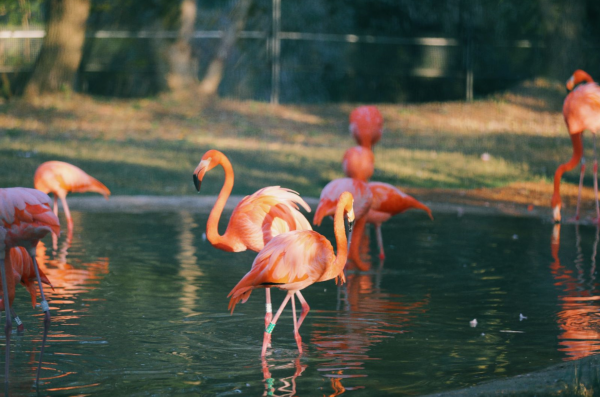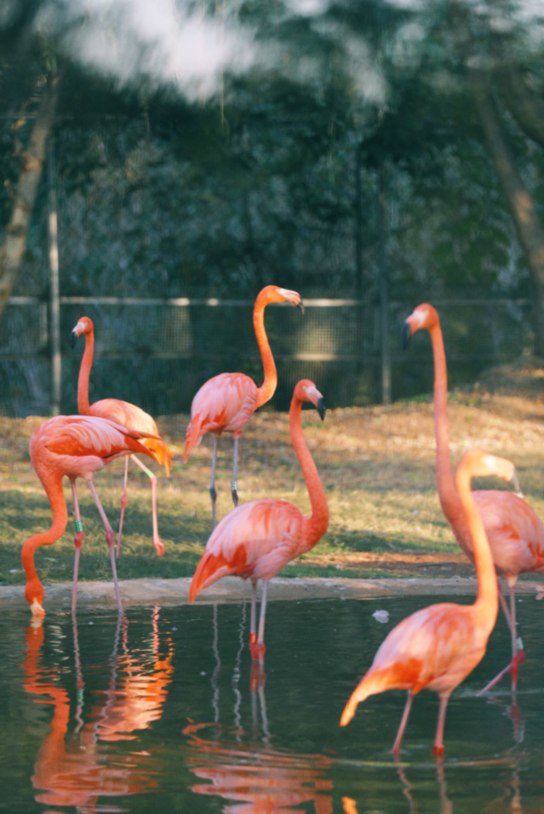 三五成群的火烈鸟什么事也不干,只是伫立在水塘里梳洗羽毛,对着水面“梳妆打扮”,光泽感十足的翅膀羽毛,宛若一团熊熊燃烧着的烈火。