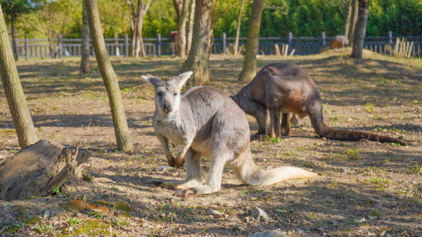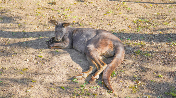 袋鼠双手摆放在胸前,仰面倒在地上,或侧躺着,微眯着双眼感受阳光,在阳光的庇护下,尽情放松。