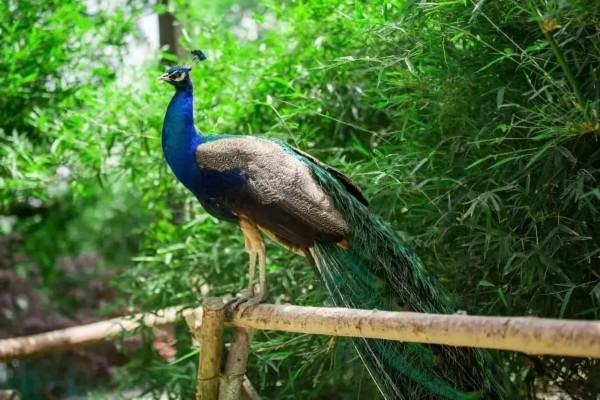 孔雀优雅又不失仪态地悠闲散步,颈部和腹部的蓝色羽毛,光彩熠熠,美丽异常。