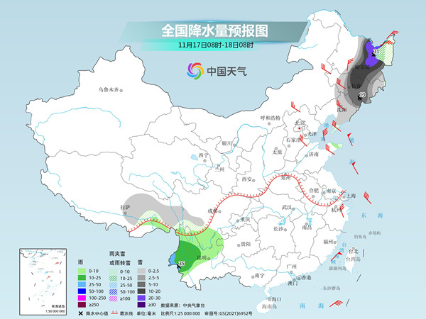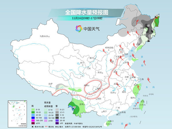 后天,黑龙江中东部、吉林中东部等地部分地区有中到大雪或雨夹雪,其中,黑龙江中部、吉林中部和东南部等地部分地区有暴雪到大暴雪,局地特大暴雪(30~31毫米)。云南西部部分地区有中到大雨(25~35毫米)。