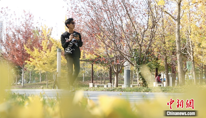 2023年10月,印尼留学生陈君其在校园中漫步,拍摄秋景。高莹 摄