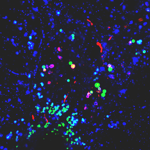 塑料纳米粒子(绿色),在显微镜下可见,与神经元溶酶体(蓝色)中的蛋白质聚集体(红色)混合。图片来源:杜克大学健康中心
