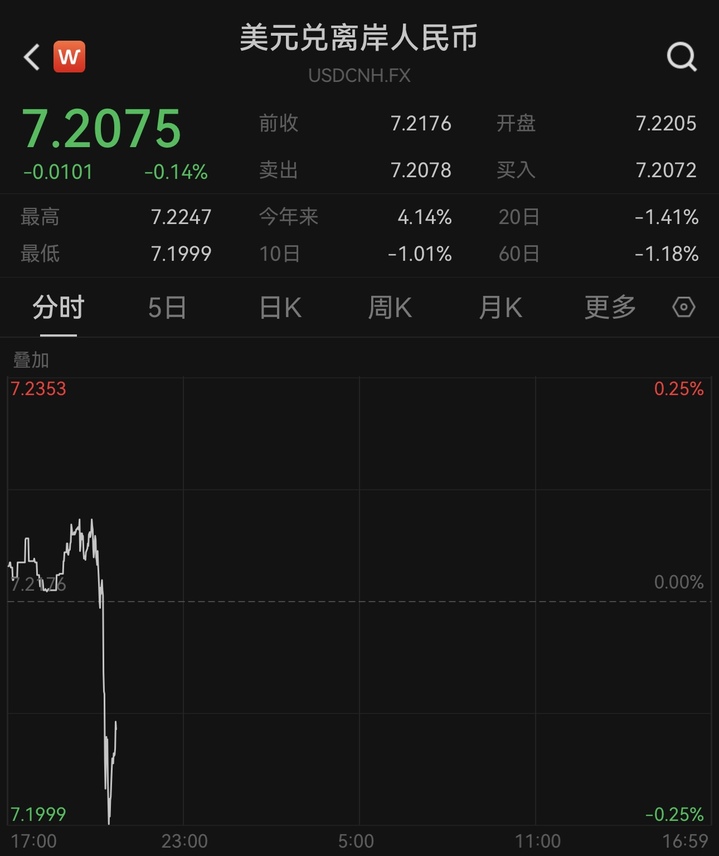 继在岸市场后,人民币对美元汇率在离岸市场也升破7.20关口。